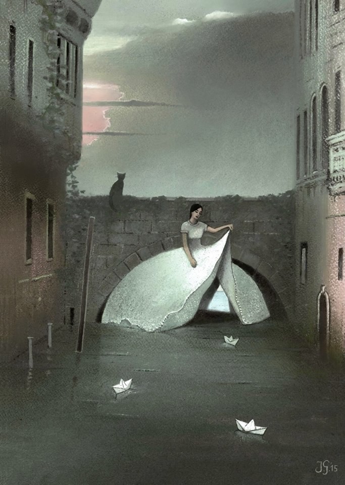 Enquanto a Lua estava escondida, deixei divagar meus pensamentos, não fosse ela levar alguns. Caminhei devagar sobre as águas e pousei minha prece num barquinho de papel. Levou-o a brisa na água calma e tardia. Lá do outro lado da ponte era dia.