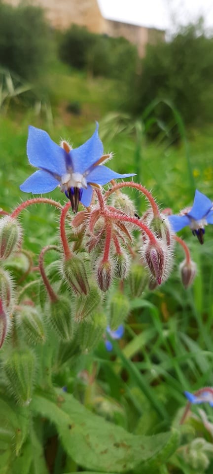 Hoje trago outra obra de arte na natureza, a borragem, de um azul céu, que faz lembrar os dias longos de Verão em que a preguiça reina e convida à reflexão. Parece que se envergonha, deixando as suas flores a olhar o chão. Cachos azuis que sobressaem nos vários verdes que lhe rodeiam. Comestiveis, e com diversas propriedades dignas das mais finas flores.