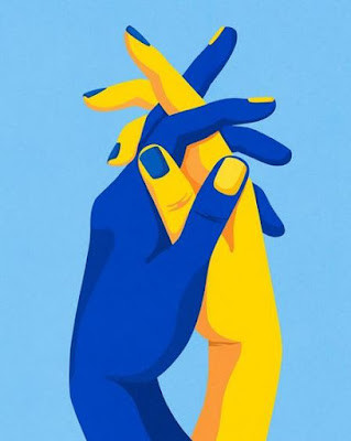 Apressei o passo pois a hora do almoço passa rápido, na minha frente ia uma mulher com uma miúda pequena pela mão, talvez com quatro anos, cabelo loiro penteado num rabo-de-cavalo minúsculo espetado no alto da cabeça, trazia vestido um casaco polar cor-de-rosa que lhe dava até ao joelho, eu na pressa nem tinha dado conta que ela me fazia adeus, em passo apressado alcancei-a depressa e mais uma vez ela voltou-se para trás para me fazer adeus, retribuí sorrindo, mas depois lembrei-me que tinha a máscara na cara, levantei a mão e acenei-lhe de volta, verifiquei que ficou feliz com o meu gesto.  Entretanto, tínhamos chegado perto da passadeira, aproximou-se uma senhora para também passar a estrada, a miúda puxa a mãe para perto da mulher, e sem nunca largar a mão da mãe a miúda faz festinhas à mulher, a senhora contente com o gesto pergunta-lhe o nome, não percebi o que a miúda disse, apenas ouvi a mulher responder-lhe "não sabes falar?", para logo depois perguntar à mãe: "vieram da Ucrânia?", ao que a mãe respondeu com um afirmativo aceno de cabeça, entretanto já a miúda tinha agarrado a mão da senhora, por momentos ficaram as três de mãos dadas, senti as lágrimas nos olhos perante a ternura daquela miúda, nada do que possa aqui escrever é capaz de descrever aquilo que senti, foi um momento tão límpido de amor, que julgo que é isto que se chama um sentimento de Paz.